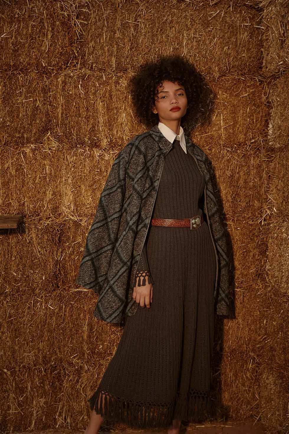 El vestido de lana de apertura viene con un chal con flecos incorporado, algo así como una versión elevada de un abrigo de manta o un poncho.