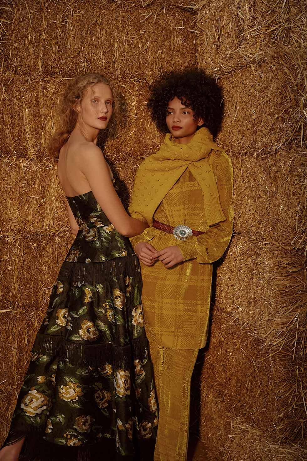 Varios estilos están ceñidos con estilo vintage, cinturones de color turquesa, y cárdigans de gran tamaño hasta una lujosa túnica y pantalón en terciopelo azafrán.
