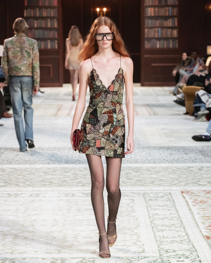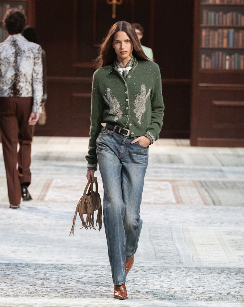La sastrería adopta una nueva actitud: elegante, sí, pero vivida. Trajes que pasan del día a la noche, denim elevado para la tarde, y una sensación de ocasión cotidiana. Jeans flocados con terciopelo, bordados que funcionan como puntuación visual y trajes “boyfriend” que migran de un guardarropa a otro. Hay un aire de lo amado y usado, de lo que permanece.