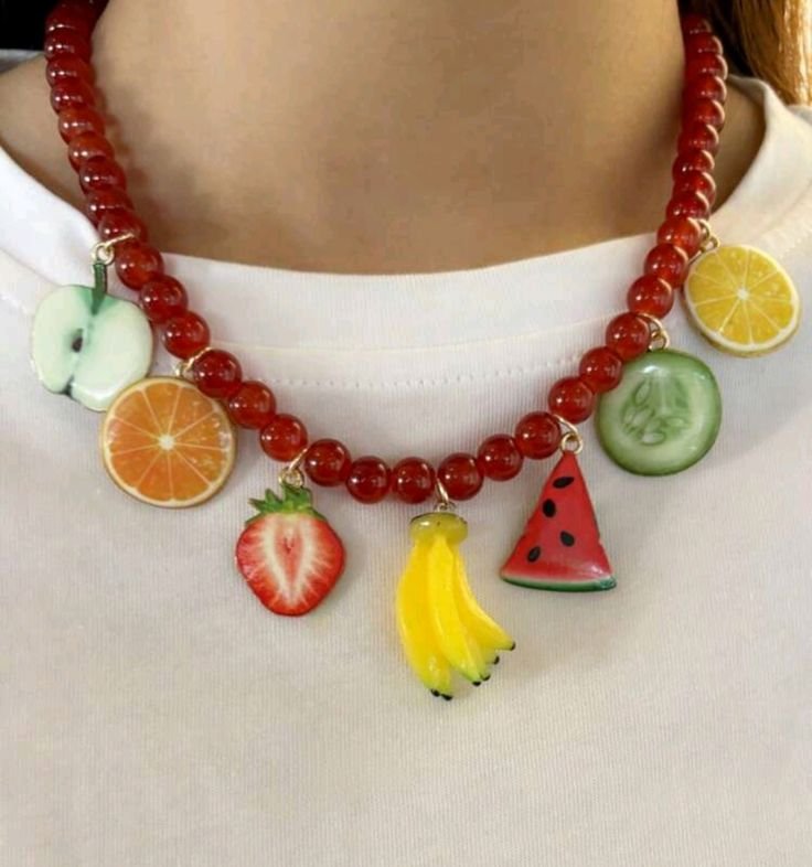 En Zara y Mango ya puedes encontrar interpretaciones más minimalistas del trend, con charms de uva o cereza colgando de cadenas doradas. Y si te gusta la exclusividad, explora Etsy: hay diseñadores que hacen piezas one-of-a-kind con técnicas de vidrio soplado, cerámica o resina.