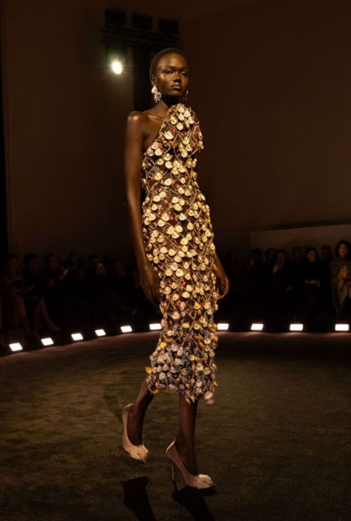 Las piezas vistas en pasarela —collares monumentales, pendientes escultóricos, broches dorados y ornamentos corporales— parecen haber sido desenterradas de otra era. No brillan por perfección, sino por su carácter arcaico: superficies irregulares, volúmenes exagerados y una sensación de objeto ceremonial más que accesorio decorativo.
