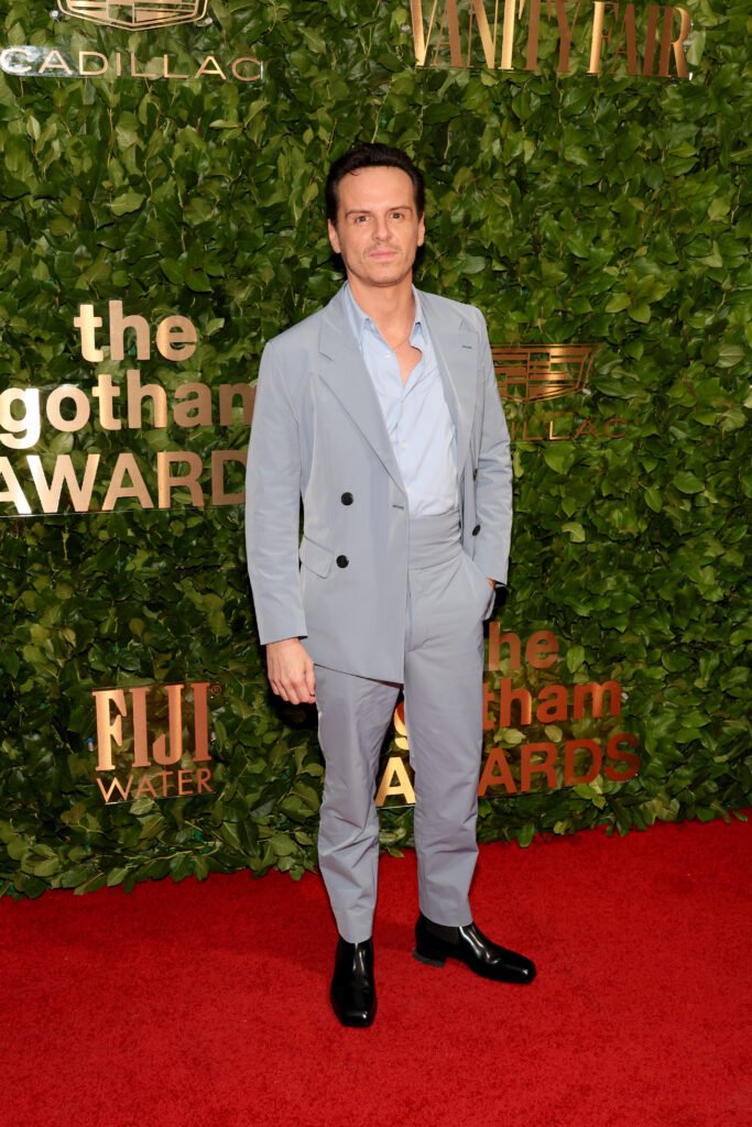 Andrew Scott, nominado a Mejor Actuación Protagónica, vestía un traje azul piedra confeccionado en tejido ligero técnico elástico combinado con una camisa de popelina cerúleo, rematada con un cinturón fajín y botas negras de cuero cepillado. Todo de Prada