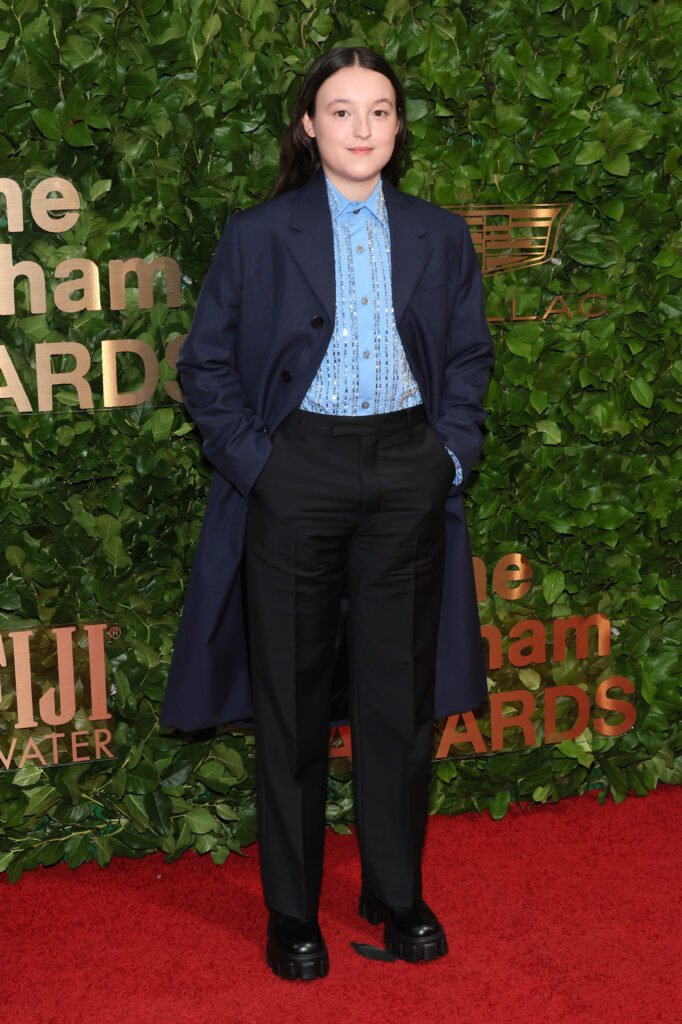 Bella Ramsey, nominada a Mejor Actuación en una Nueva Serie, lució un abrigo azul marino de panamá mohair, pantalones azul marino de kid mohair y una camisa de popelín azul claro adornada con bordados de cristales. Terminaron el look con botas negras de cuero cepillado en PRADA.