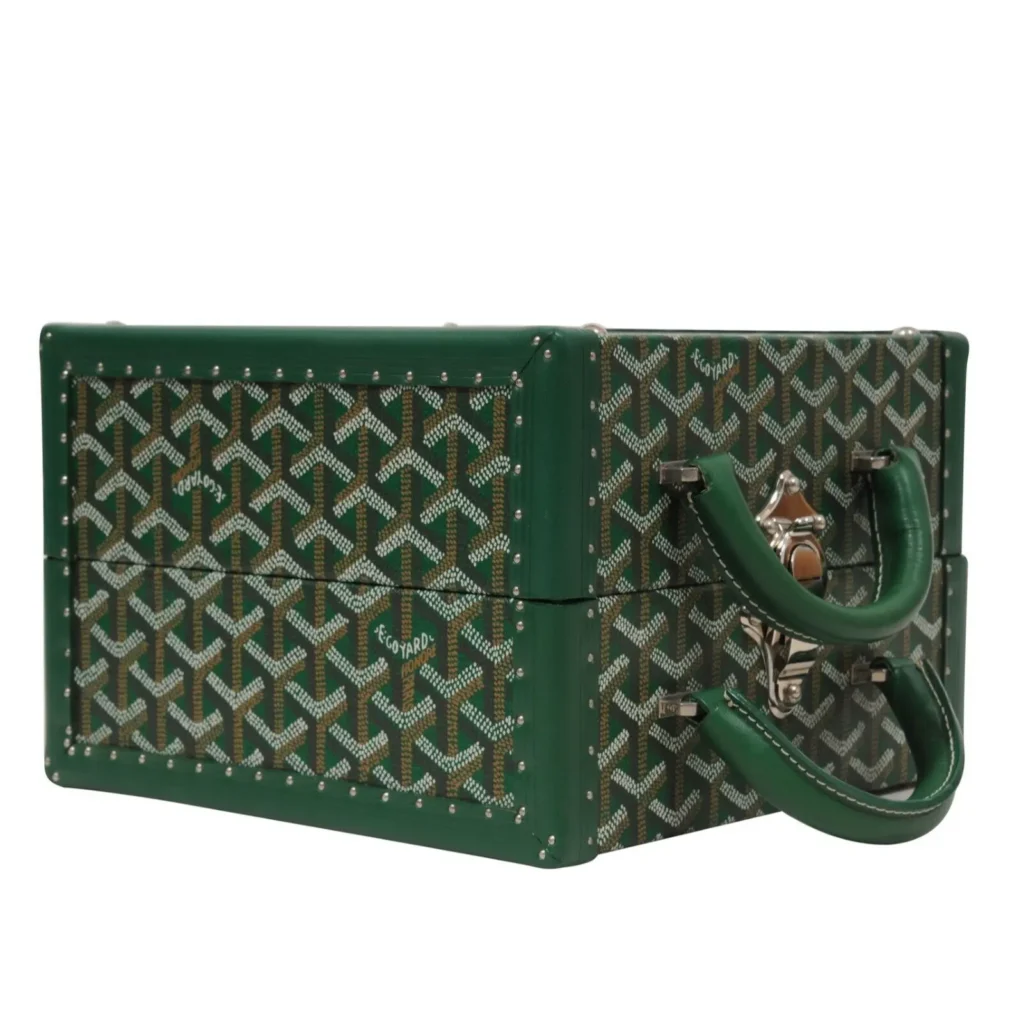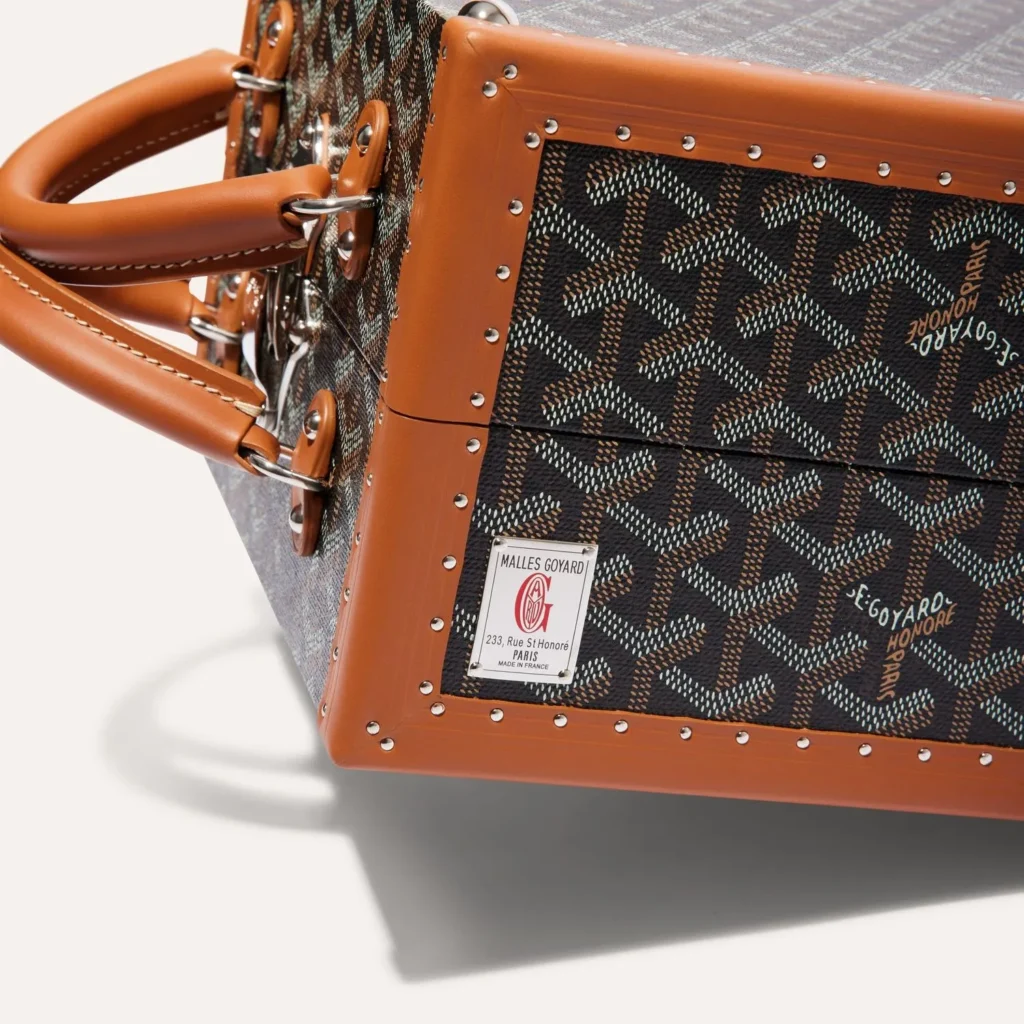 El exterior está fabricado en materiales de piel de alta calidad, con el tradicional patrón Goyardine que se caracteriza por su estilo atemporal. Los colores más populares incluyen tonalidades clásicas como negro, amarillo y café, pero también se lanzan versiones en ediciones limitadas con colores como azul o rojo. El maletín incluye asas de piel que lo hacen cómodo de transportar, además de que incluye un name tag, la cual es una etiqueta distintiva que añade un toque de exclusividad.