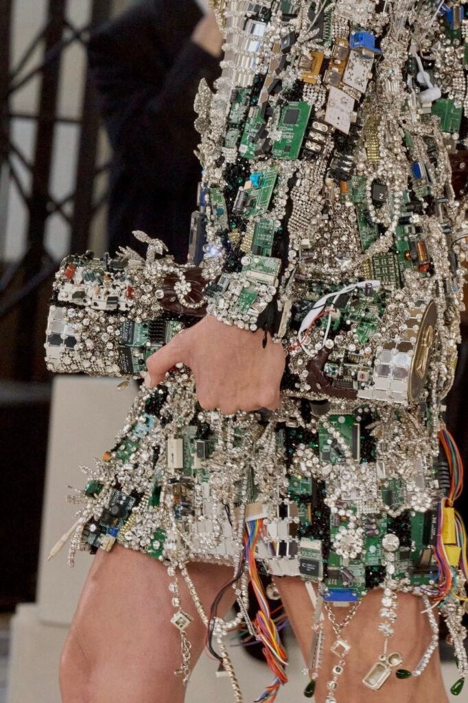 Fueron 32 salidas en cuáles las prendas llamativas se colocaron en un vestido confeccionados con ventiladores de ordenador, placas, calculadoras, celulares que mezclaban paillettes cuadradas, cadenas de strass y collares de perlas.