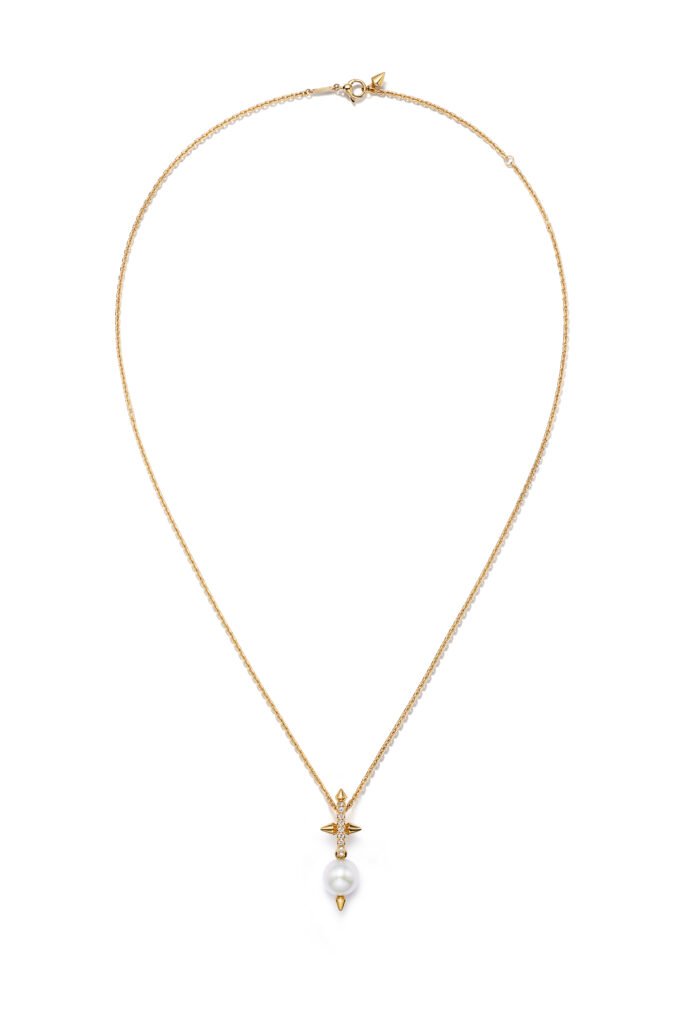 Los nuevos diseños de Tiffany Titan by Pharrell Williams yuxtaponen el motivo de lanza de diamantes con perlas de más de 11 mm; como resultado, forman siluetas distintivas en collares, pulseras, anillos y aretes.