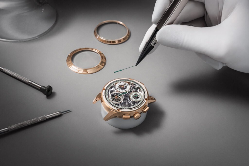 Cada uno de los 696 componentes ha sido decorado a mano. El nivel de acabado es tan detallado que el tiempo invertido en decorar las piezas duplicó el tiempo de ensamblaje. Desde los puentes con acabado negro NAC hasta los engranajes en titanio, todo fue pensado para ser visto, admirado y celebrado.