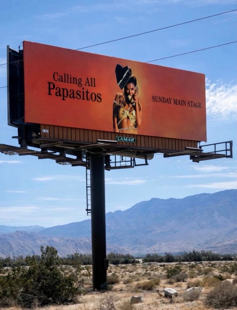 Históricamente, los billboards de Coachella han servido tanto para promocionar headliners como para posicionar marcas, pop-ups y experiencias paralelas al festival.