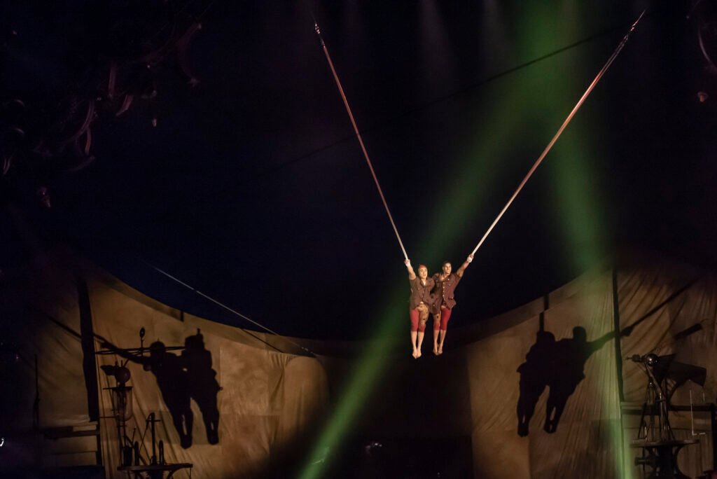 Los ‘gemelos siameses’ que cuelgan en el aire sujetos a correas por fin se separan cuando vuelan alto sobre el escenario en una serie de figuras acrobáticas, algunas veces como un dúo y algunas veces solos. Los dos artistas alcanzan alturas impresionantes y se cruzan por encima del escenario mientas realizan figuras sincronizadas que requieren una coordinación perfecta.