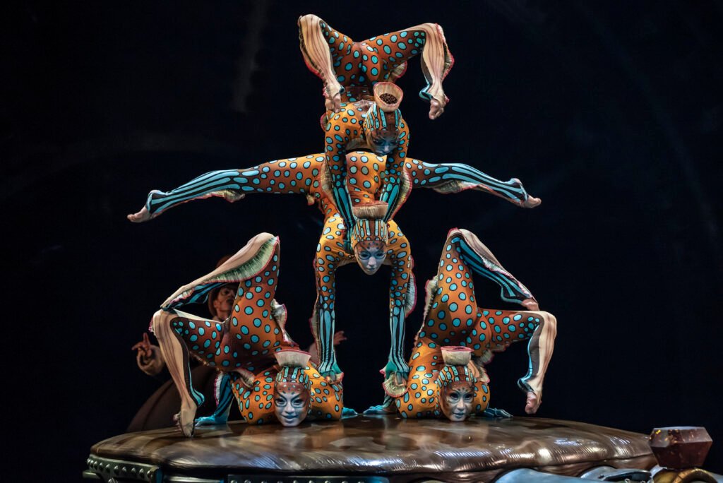 Un grupo de 13 artistas realiza secuencias espectaculares de acrobacias perfectamente sincronizadas y pirámides humanas que demuestran la increíble agilidad del cuerpo humano. Además de ponerse de pie uno sobre los hombros de otro, formando una columna de tres o cuatro personas, los artistas se lanzan, realizan saltos mortales y se cruzan en el aire en tres niveles: el piso, un monolito ubicado en el centro del escenario y en la audiencia.