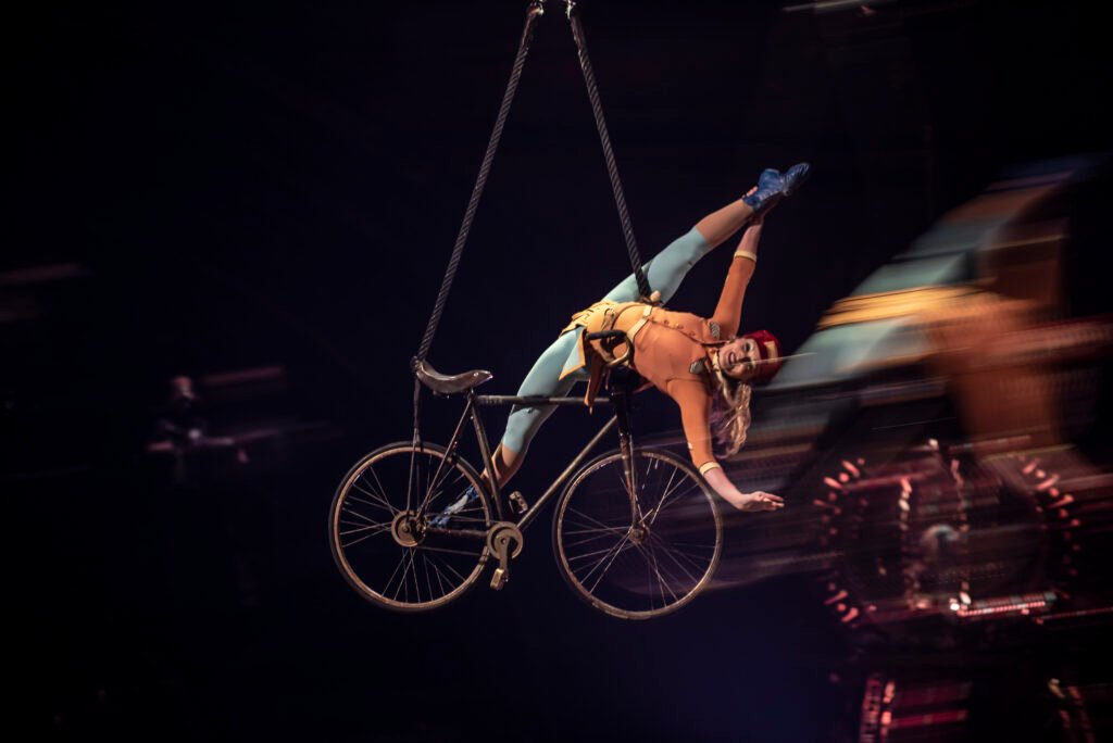 Una acróbata salta en su bicicleta acrobática suspendida en el aire y se cuelga en una variedad de posiciones – sosteniéndose en la base del manubrio o en la llanta, por un pie o un brazo. Incluso se posa en el asiento, con las manos en el manubrio y los pies en los pedales… ¡pero tanto ella como la bicicleta están de cabeza!