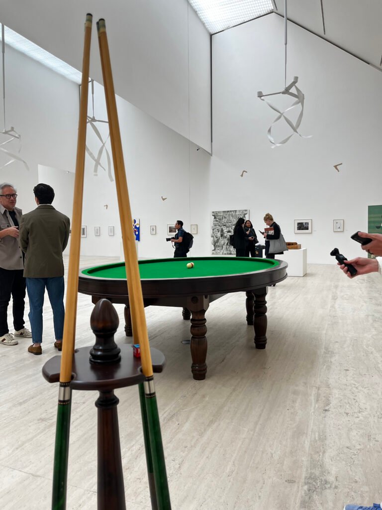 Los visitantes podrán interactuar con la obra, que presenta dos mesas de ping-pong divididas y dispuestas alrededor de un estanque artificial. Mesa de Ping Pong con estanque (2025) es una de las muchas obras basadas en juegos que se muestran en la exposición y ejemplifica el interés del artista por la idea de la escultura en la esfera pública.