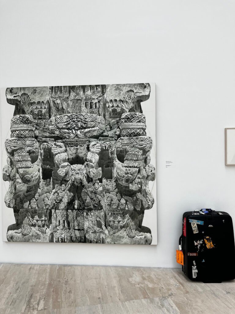 Una de sus obras más importantes es la Coatlicue y la presencia de una maleta a un lado con los stickers despegados, esto es, el reflejo o quizá al espectador es el resumen de su obra.