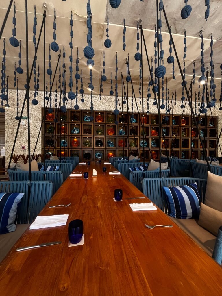 Otra de las sugerencias imperdibles son el restaurante ‘Encanta‘, esta cocina de autor por el Chef ganador de una Estrella Michelin Paco Méndez, quien pone en alto a México desde el Mediterráneo hasta el Caribe te recibe con posibilidades de vista al foro donde cada noche realizan un show musical, o de manera más íntima dentro del restaurante donde la poca luz lo vuelve un lugar elegante, sofisticado y delicioso para deleitar la variedad de vinos y el menú que es conformado por 5 tiempos sin contar los postres y el cierre que es un shot de mezcal y un bombón artesanal en forma de gusano de maguey.
