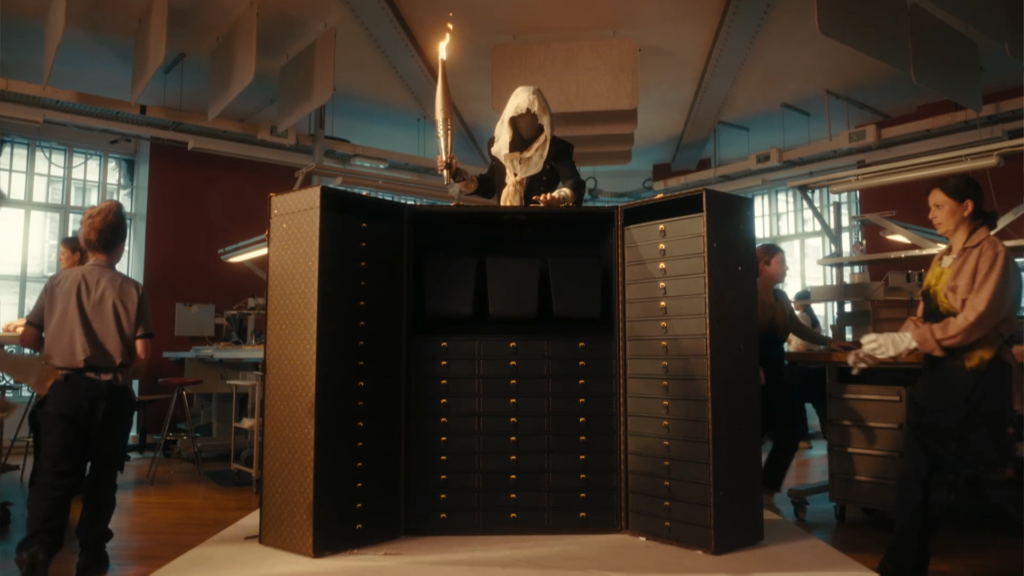 La escena comienza en los tejados de Louis Vuitton en el Pont Neuf, donde, en una puesta en escena audaz, un portador de la antorcha enmascarado recorre ágilmente los talleres de la maison. La fabricación del baúl para las medallas de Louis Vuitton, un arte que se encuentra entre la acrobacia y la excelencia técnica nacida de un savoir-faire excepcional.