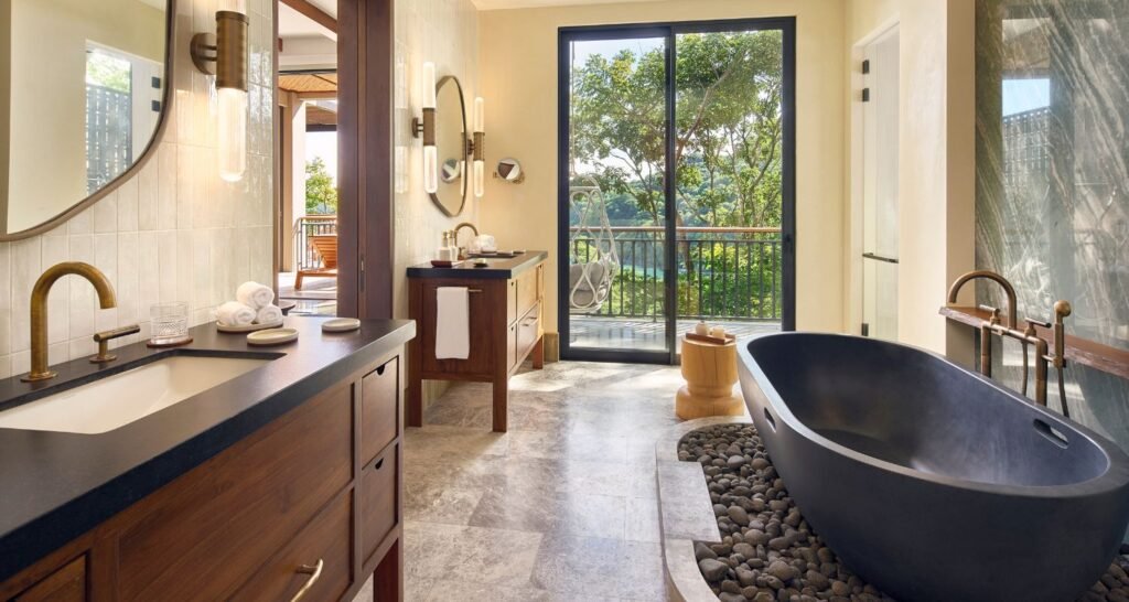 Las habitaciones, suites y villas están pensadas como refugios abiertos. Puertas de vidrio de piso a techo, duchas al aire libre, piscinas privadas y bañeras profundas borran la frontera entre interior y exterior. La artesanía local aparece en la carpintería, los textiles y los detalles, siempre con una estética contemporánea.