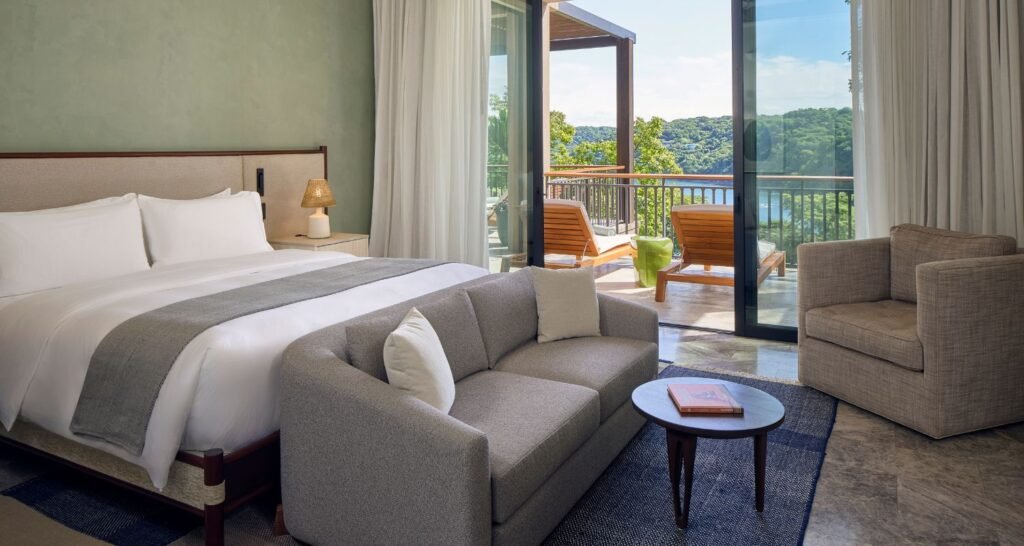 La bienvenida sucede en capas. Primero, La Casita, íntima y cercana, inspirada en los pueblos costarricenses. Luego, La Casona, el corazón social del resort, una reinterpretación elegante de las haciendas guanacastecas con vistas abiertas al océano. Entre ambas, un árbol de ceiba marca el pulso simbólico del lugar.