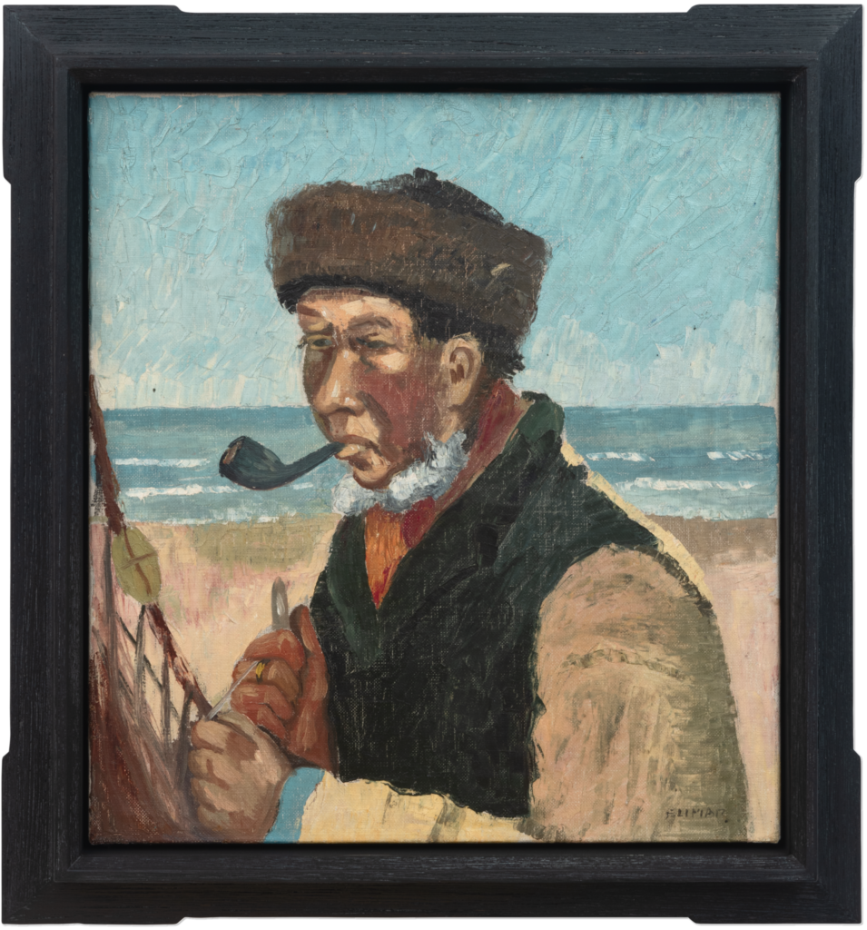 La pintura, que mide 45,7 por 41,9 centímetros, muestra a un pescador de barba blanca fumando en pipa mientras repara su red. Este retrato está basado en una obra del artista danés Michael Ancher (1849-1927) y es una de las muchas interpretaciones que Van Gogh realizó de trabajos de otros artistas.