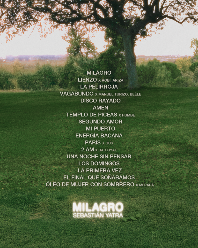 En Milagro, Sebastián Yatra abre su universo creativo con 17 canciones que reflejan su estilo con sonidos más introspectivos, colaboraciones inesperadas y letras cargadas de emociones. Entre los temas ya conocidos como “Vagabundo”, “2AM” y “La Pelirroja”, y nuevas colaboraciones como “Templo de Piceas” junto a HUMBE, y otras que prometen ser himnos emocionales.