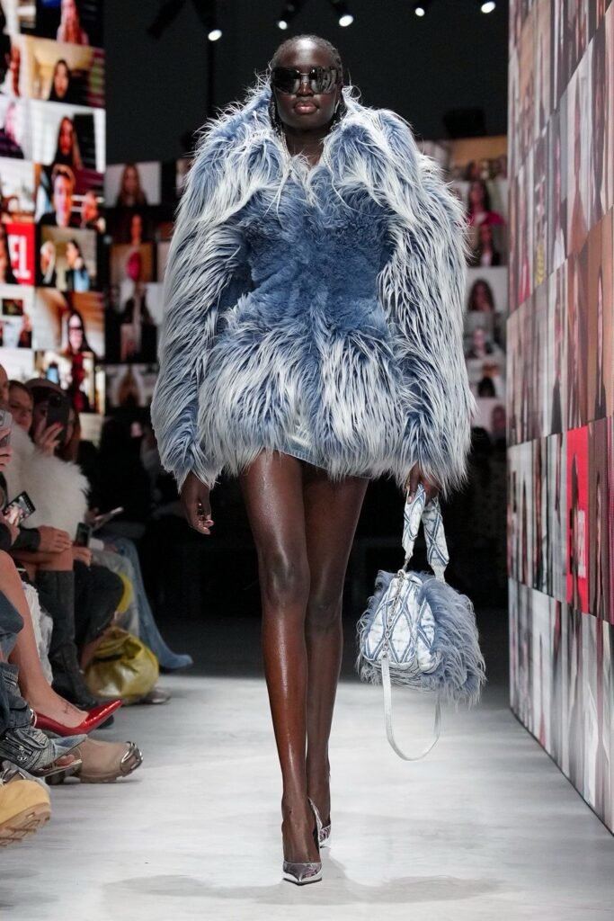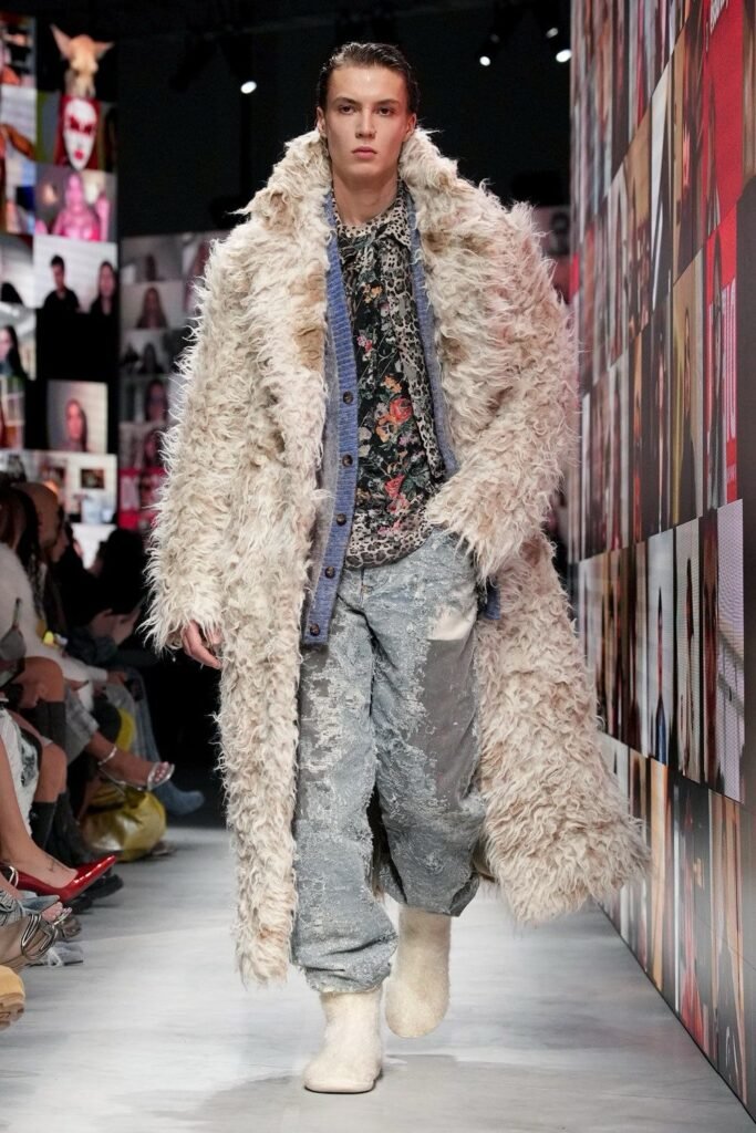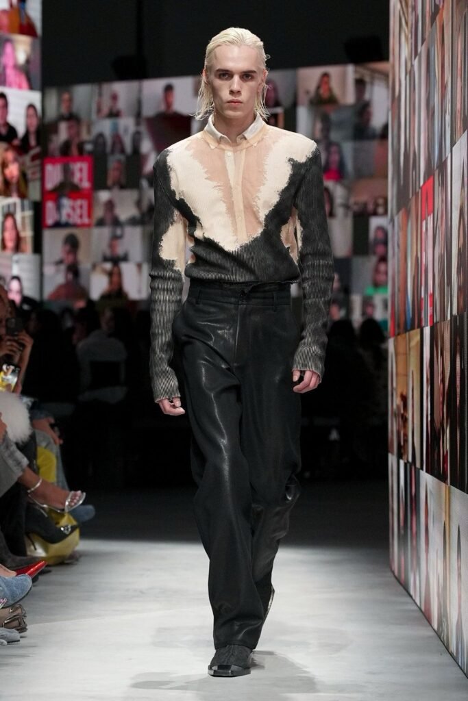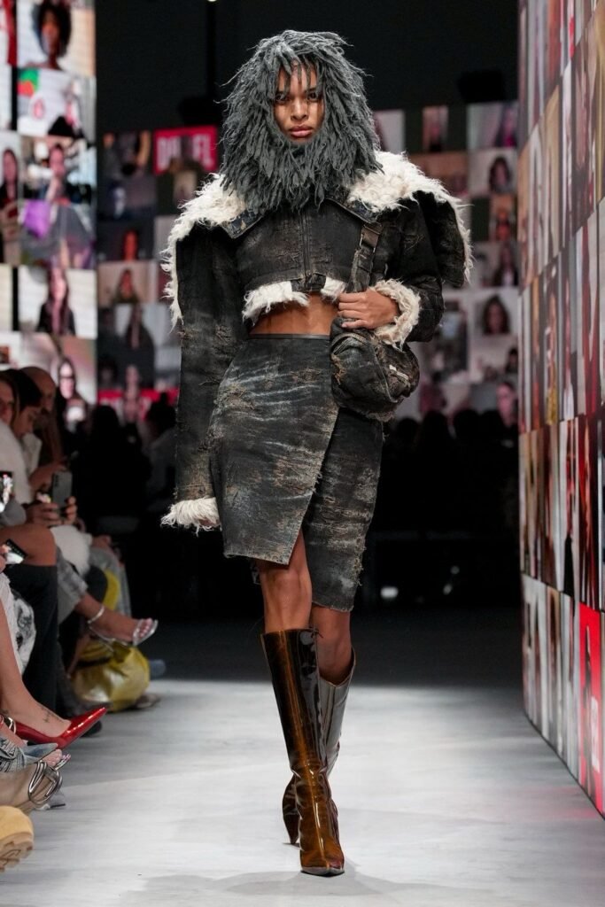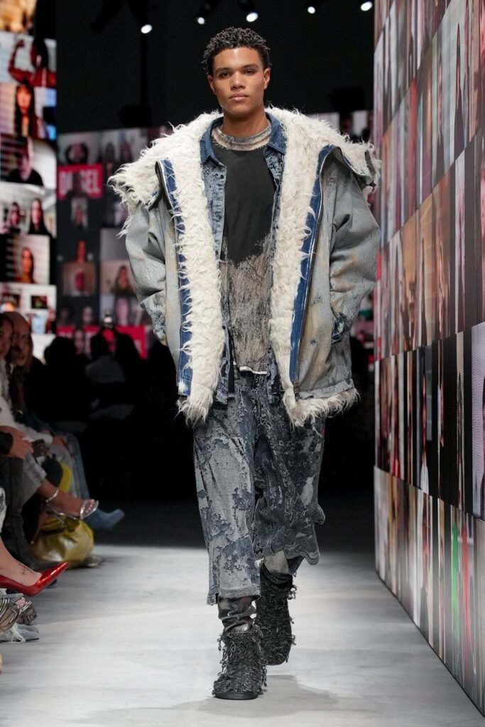 Martens, quien no solo está haciendo un buen trabajo en la producción de sus desfiles, goza de un aumento del 13,1% en las ventas el año pasado. En la pasarela vimos los textiles de mezclilla y jersey, dos pilares vitales del guardarropa de Diesel, en nuevas estructuras unidas, tratamientos de recubrimiento y acabados desgastados, mientras que el diseñador experimentó con manipulaciones bidimensionales en materiales difusos.