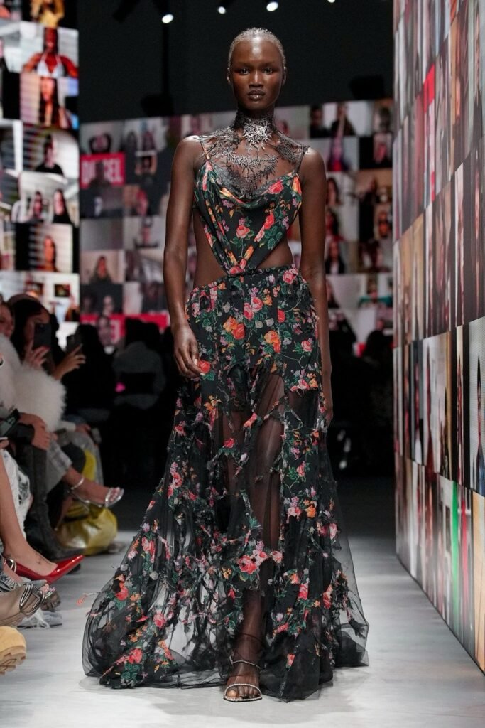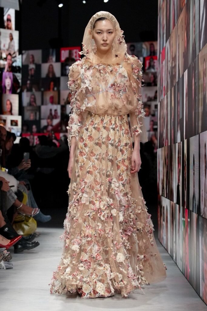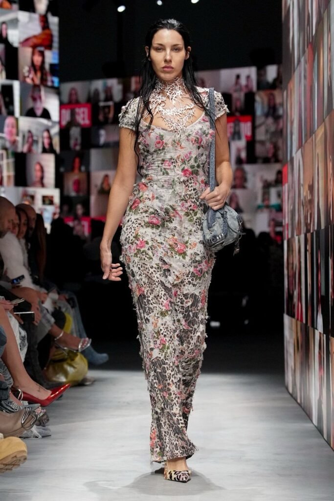 Los estampados florales de guepardo dominaban los conjuntos de jersey; las blusas envejecidas hacían alarde de secciones transparentes que estaban destinadas a imitar las líneas de sudor posteriores a la fiesta, y los abrigos, chaquetas acolchadas, prendas de punto acanaladas y faldas hechas con piel sintética lucían más lujosos en colores caleidoscópicos. Mientras tanto, la ropa formal, desprovista de la sastrería clásica, los textiles de mezclilla y cuero preferidos, y las prendas separadas llamativas se cubrieron en capturas de pantalla de la llamada de Zoom codificada por Diesel. Aquí, Martens sirvió hábilmente de plataforma a los fanáticos de la marca con una estrategia refrescante e inclusiva, reforzando su inquebrantable frenesí durante la próxima temporada.
