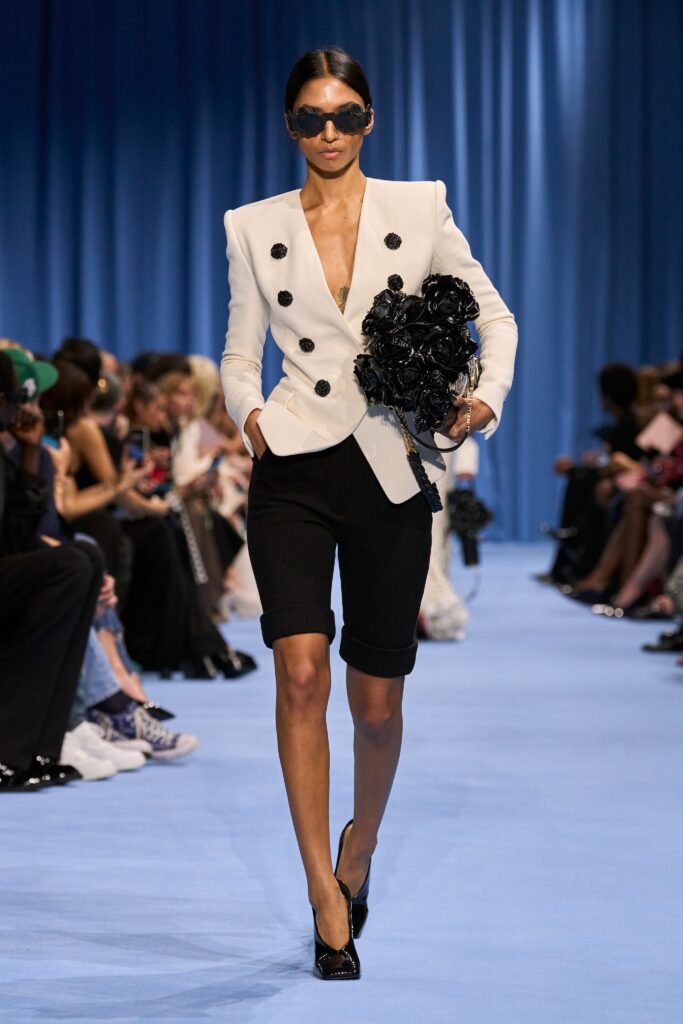 Para lograr este runway compuesto por 55 salidas en las que el equipo de Balmain trabajo de manera veloz para esta icónica presentación es como la colección femenina se mostró en una locación en tono azul baby para enaltecer las prendas que fueron desde los clásicos negros y blancos para pasar a propuestas más vivas.
