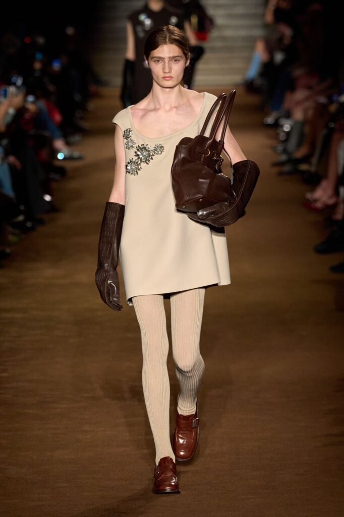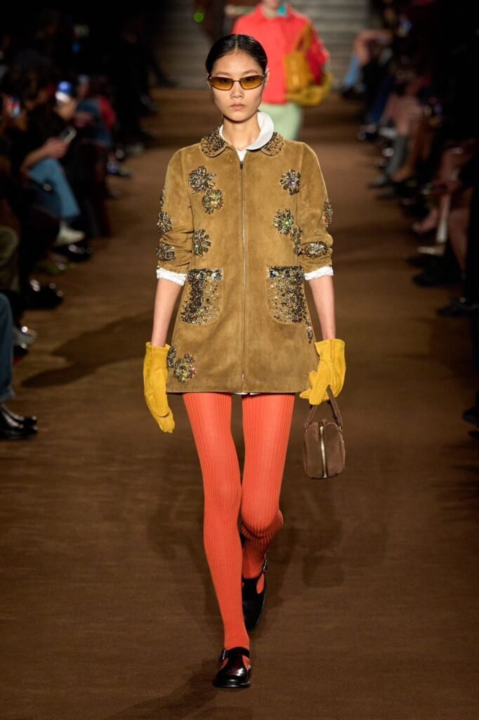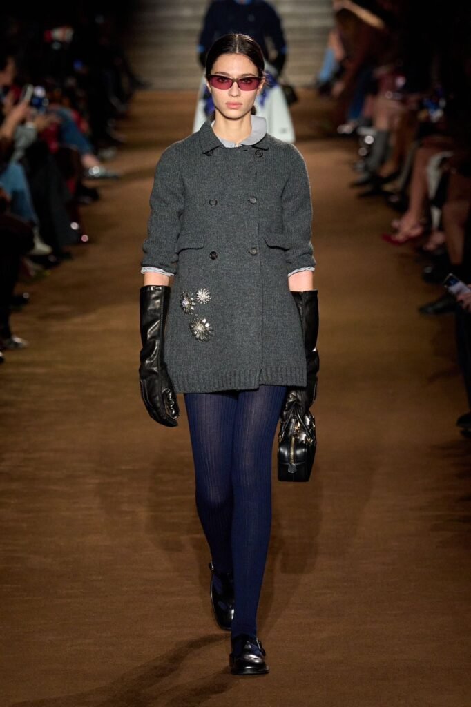 La propuesta de Miu Miu fue envolvernos en los detalles, la casa italiana expuso broches de cristal a sus prendas, botones en gran tamaño, con un toque de los años 70, los plumíferos y las chaquetas estuvieron presentes. El tejido de punto, los estampados florales, las medias canalé, las botas planas y las flats con punta afilada así como los guantes de cuero fueron protagonistas de este runway en el último día de la semana de la moda en París.