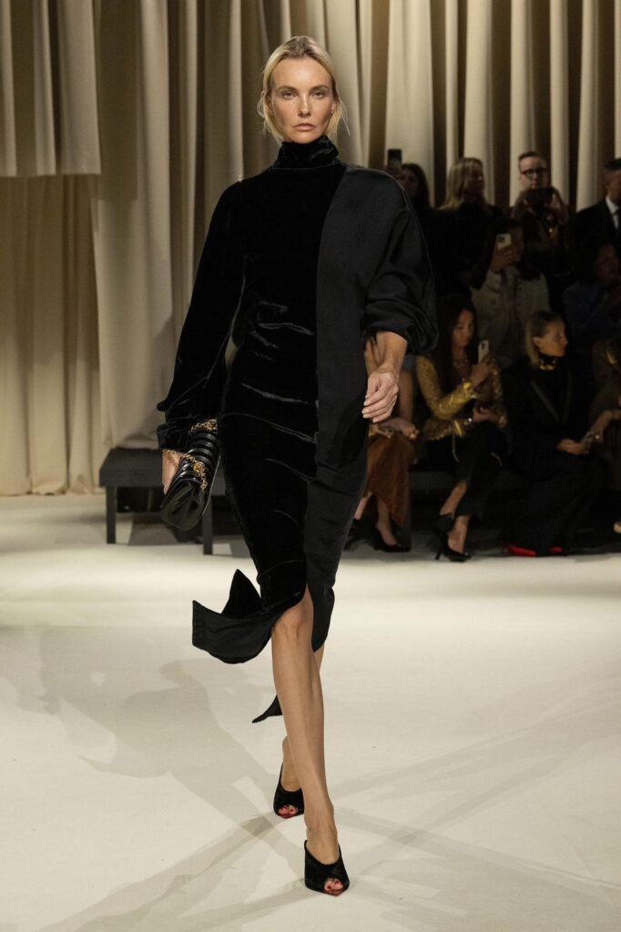 En guiños hacía la moda de los 80, las siluetas muestran una moda cómoda, elegante, sofisticada con hombros afilados, pantalones plisados que logran lucir con altura. Los drapeados y la asimetría suavizaron la estructura, agregando ese toque esencial de elegancia a la colección.