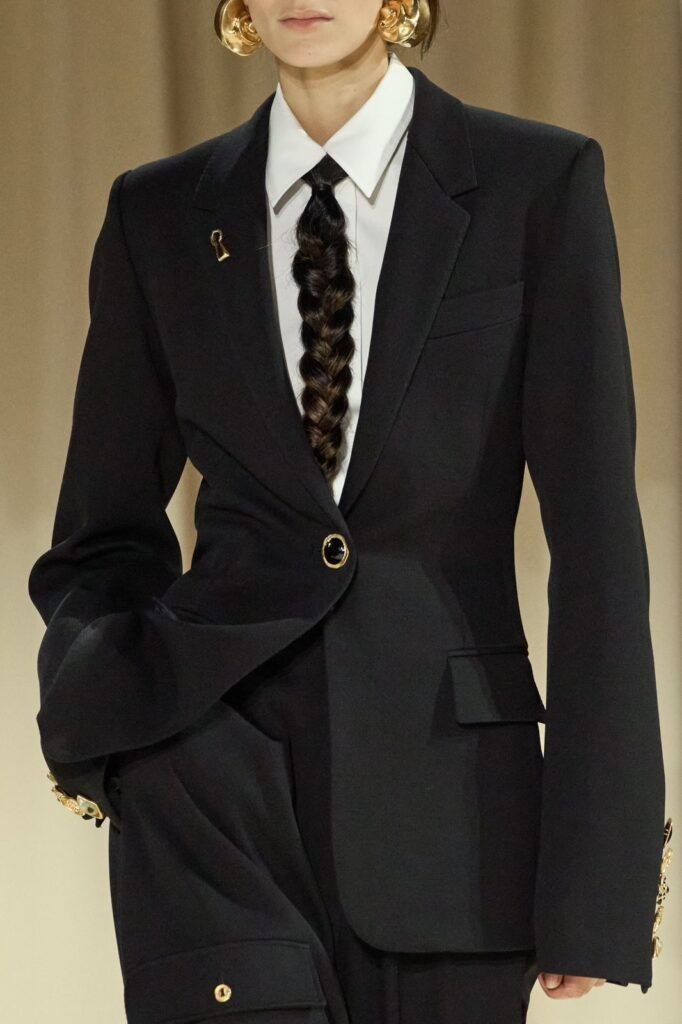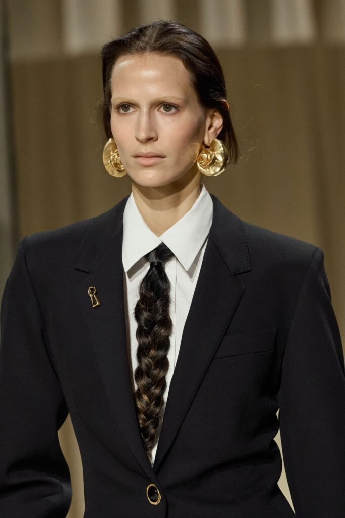 Con un encanto en la variedad de estructuras y volúmenes en una paleta de colores gris, azul, beige, blancos y color ocre, así como la presencia del denim. Recordemos que los detalles más encantadores de esta firma es que todos están dotados del color dorado así como la presencia de los corbatines en forma de trenzas han atrapado a todos los espectadores.
