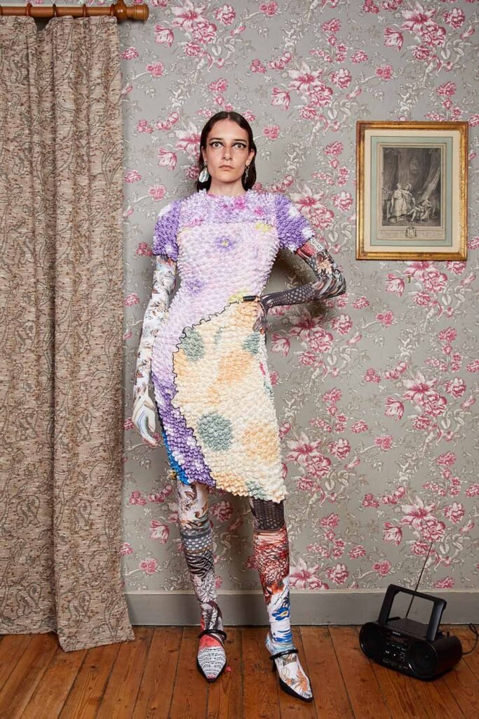Es así que vemos popcorn tops en todo su esplendor, así como los bjorkiano amados por cualquier chico rave de los 90, reutilizados en hermosos vestidos ondulados y camisetas con bobbly en capas.