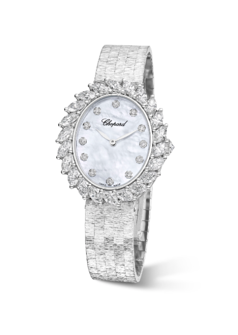 La colección L’Heure du Diamant sintetiza la riqueza de los oficios artísticos que mantiene la Casa Chopard, desde los maestros relojeros a los artesanos engastadores. Se reinventa en un nuevo reloj de caja ovalada realizado a mano en oro ético de 18 quilates, blanco o rosa, y dotado de una esfera de nácar perlado y rodeada de un engaste de diamantes talla marquesa. A juego con un par de pendientes y un colgante que incorporan los  mismos códigos estéticos, este reloj  lleva dentro toda la genialidad de los saber hacer que los artesanos de emociones de Chopard han ido conservando pacientemente a lo largo de la historia.