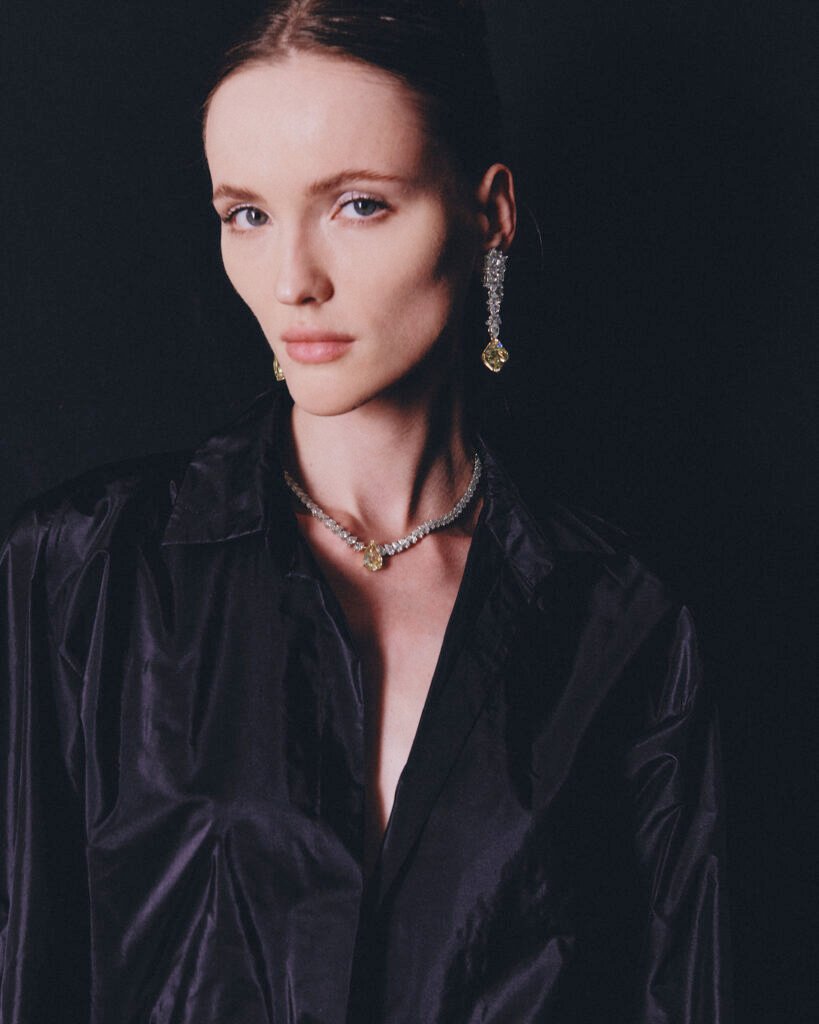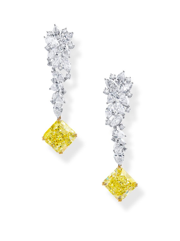 Otras piezas destinadas a sublimar un escote son dos largos colgantes adornados respectivamente con una llave de diamantes y rubís y un corazón completamente cubierto de un pavé de diamantes y zafiros azules y rosas con pendientes a juego. O incluso este suntuoso collar de perro con toques Art Déco en el que dos lengüetas de diamantes amarillos y blancos abrazan un diamante amarillo de 6,21 quilates rodeado de un microengaste en tonos a juego.