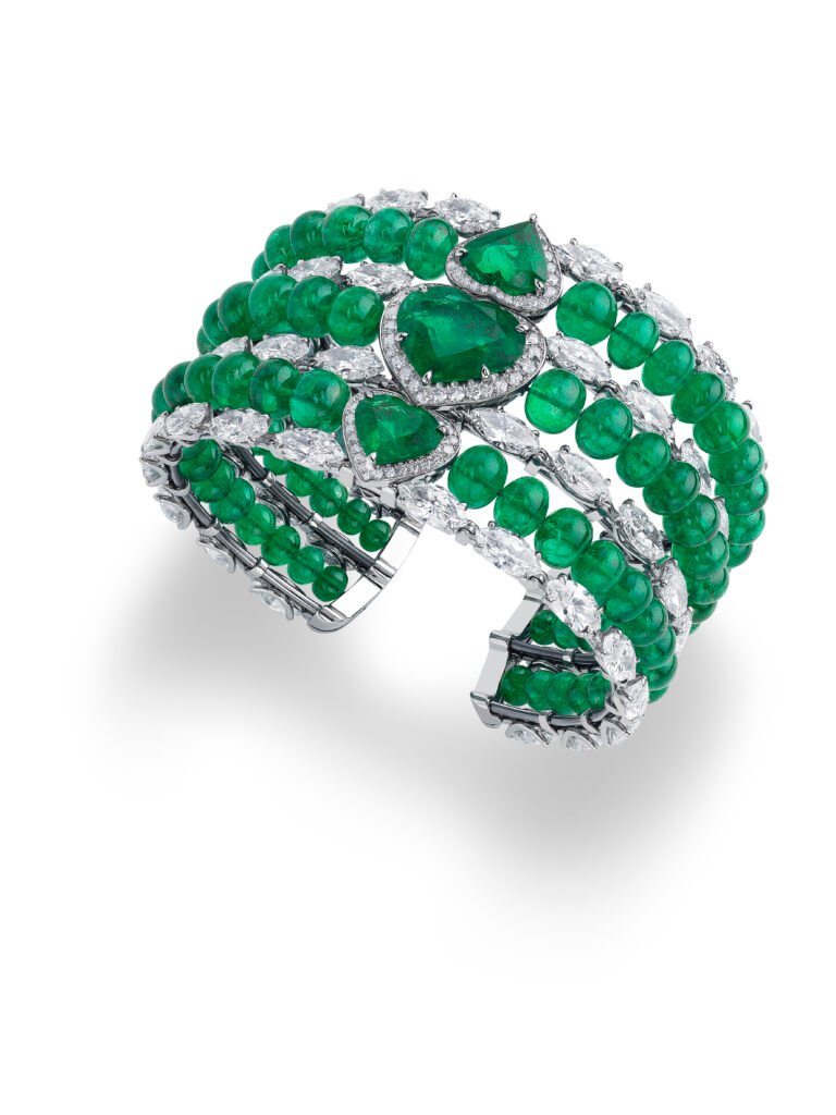 Y, por último, en la muñeca se coloca un magnífico brazalete de oro ético blanco formado por tres hileras de cuentas de esmeraldas y diamantes talla marquesa que rodean a tres esmeraldas talla corazón.