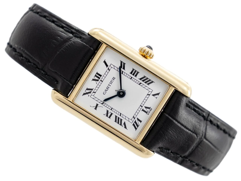 Cartier Pendiente único Juste un Clou, oro amarillo de 18 k, un reloj Louis Cartier Square Incurvée, oro amarillo de 18 quilates, piel: un reloj personal. Anillo Trinity de Cartier, modelo mediano, oro blanco de 18 k, oro amarillo de 18 k, oro rosa de 18 k.