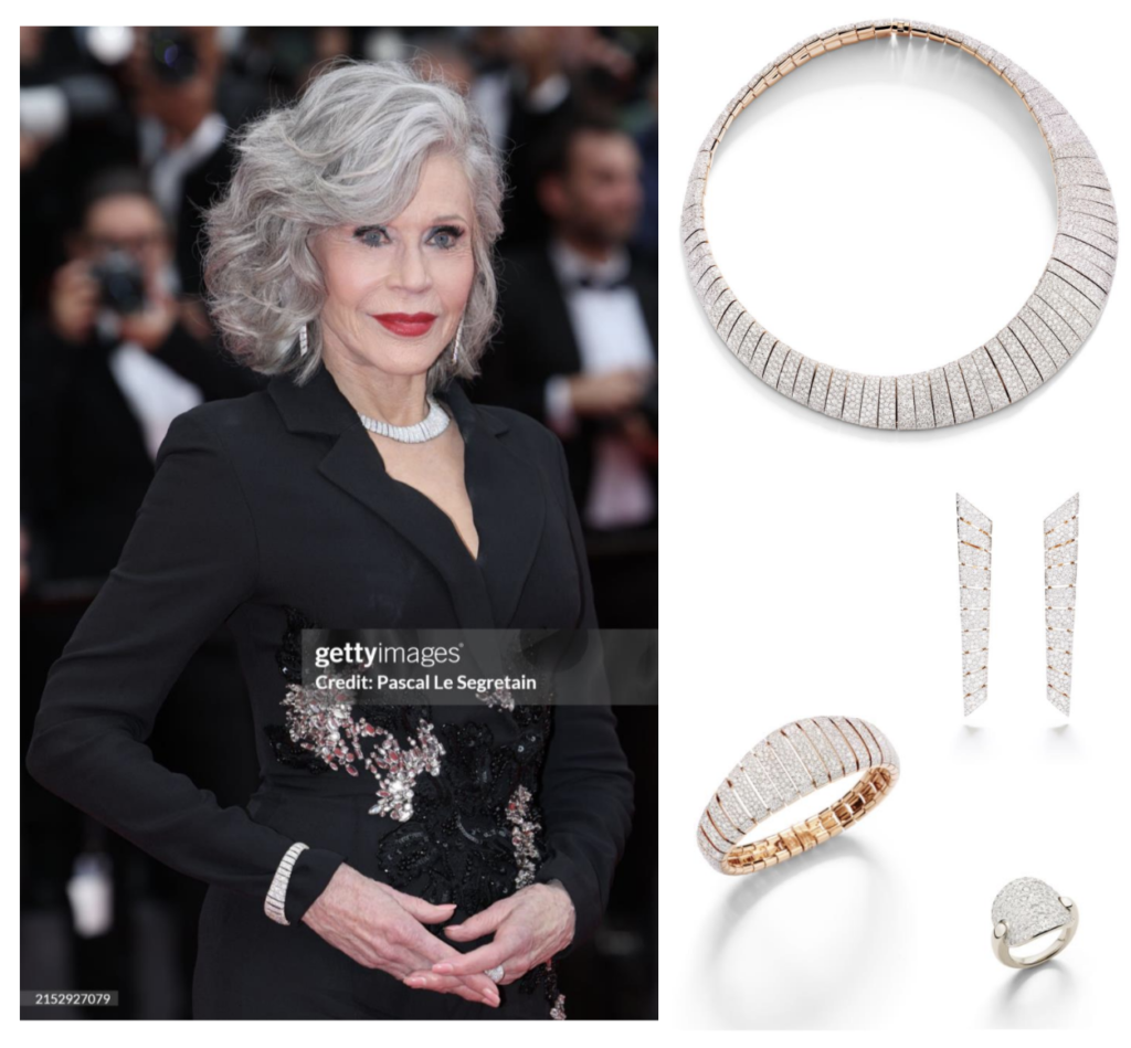 Encarnando la elegancia y el estilo refinado de Pomellato, la actriz y productora Jane Fonda iluminó la alfombra roja de apertura de la 77ª edición del Festival de Cannes luciendo una gargantilla asimétrica, realizada en oro rosa, con pavés de 2.924 diamantes blancos.