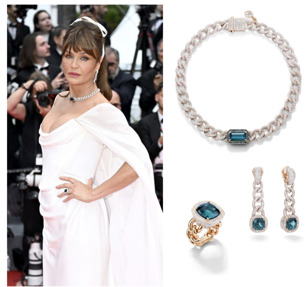 De la misma manera, la top model internacional Helena Christensen lució en la alfombra roja de apertura de la 77ª edición del Festival de Cannes, un collar Gourmette, realizado en oro rosa, con una piedra de indigolita de talla rectangular de 10 quilates, rodeada de un pavé de 203 indigolitas y cerca de 2.000 diamantes. El anillo y los pendientes a juego completan la parure de indigolita. Piezas exclusivas de la nueva colección de Alta Joyería de Pomellato, que saldrá a la venta en junio.