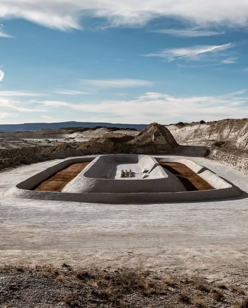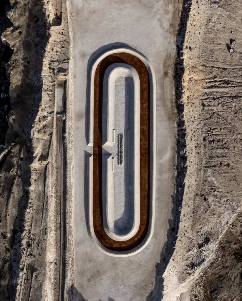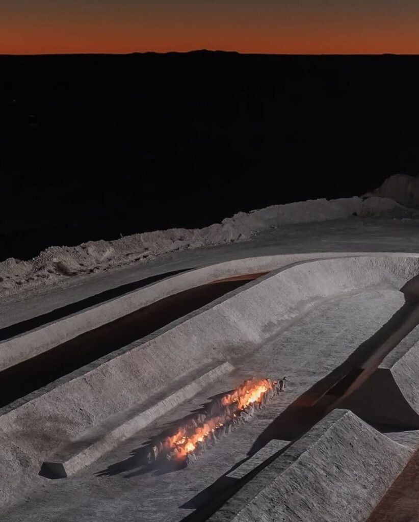 Ubicada en una antigua cantera de yeso activa cerca de Santa Fe, la pista de Adidas y PlayLab fue construida para dialogar con su entorno, no imponerse. Diseñada por el estudio PlayLab (conocido por instalaciones que habitan lo lúdico y lo meditativo), la pista se integra gracias a dos muros perimetrales —de 1 m en el exterior y 2 m en el interior— que acompañan líneas redondeadas y definen una zona de descanso con fogata. Para completarlo, utilizaron materiales locales y pintura a base de agua que desaparece con el tiempo, devolviendo el sitio a su estado original.