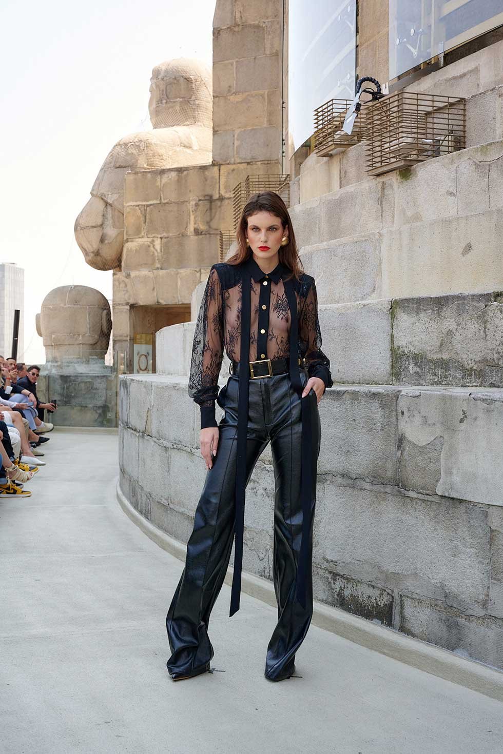En cuando a los pantalones, presentó algunos de piel, altos, además de abrigos, gabardinas, mascadas en el cuello y accesorios de joyería que formaban parte de los detalles de la moda.