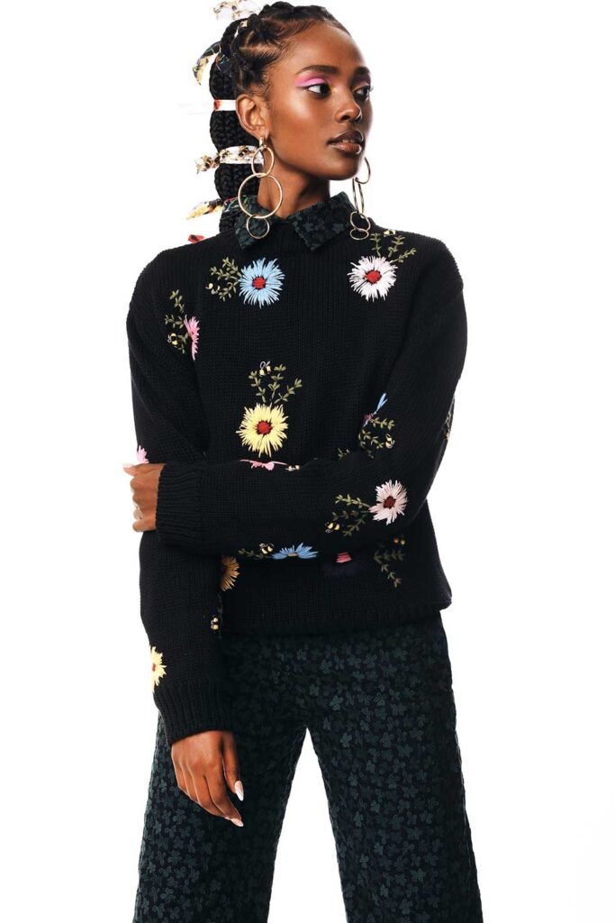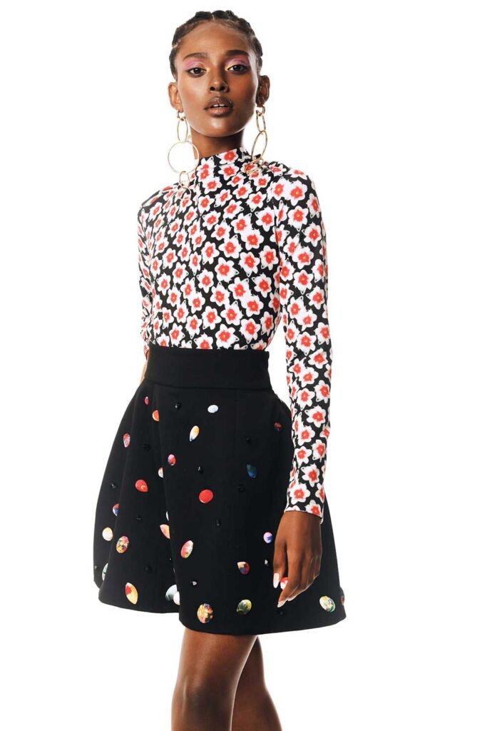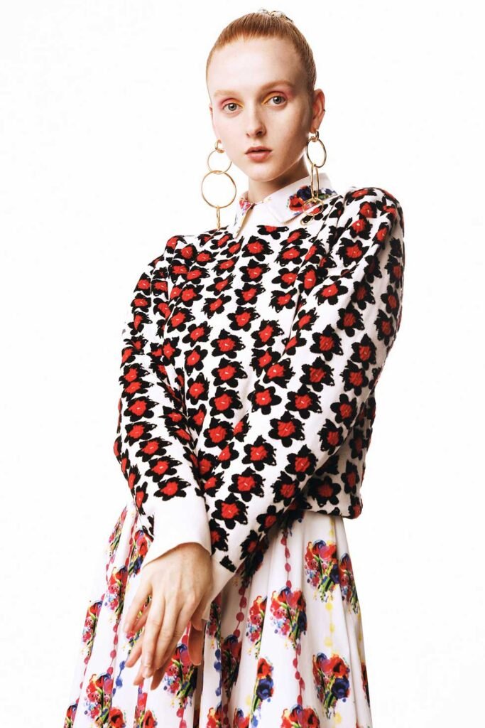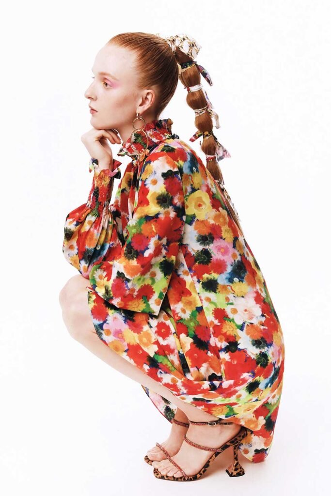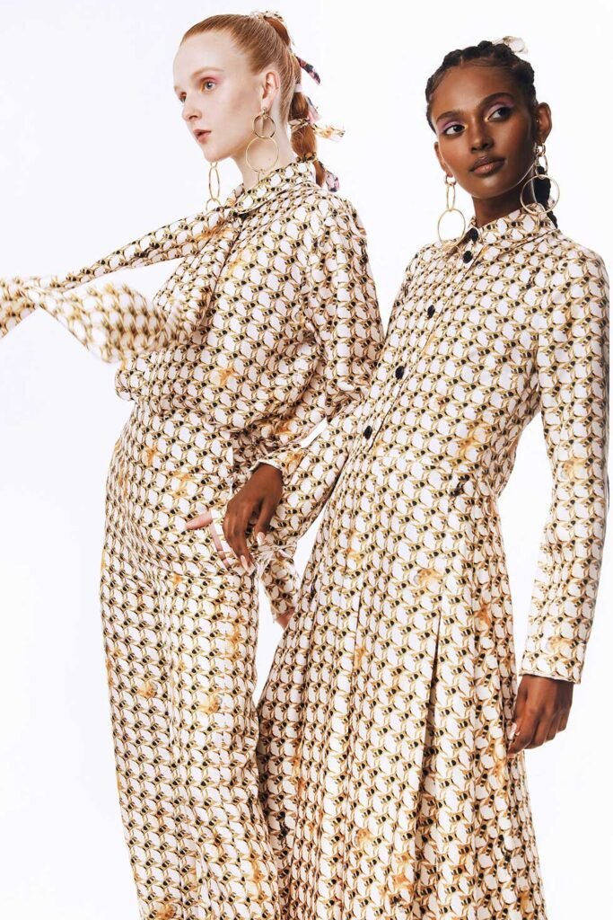 En las imágenes podemos ver vestidos drapeados de camiseta en jersey con estampado de ditsy, vestidos de línea A en un rico jacquard de flores silvestres, vestidos camiseros con un motivo gráfico de pata de gallo que revelan abejas y panales en inspección más cercana.