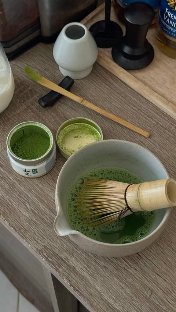 Viene de Japón y es parte de una ceremonia del té que existe desde hace más de mil años. En ese entonces, prepararlo no era solo beber: era meditar, era contemplar. El polvo verde se tamizaba con cuidado, se batía con un chasen (el batidor de bambú) y se bebía como un acto de presencia total. Hoy, esa esencia sigue viva aunque le pongas leche de avena y lo pidas para llevar.