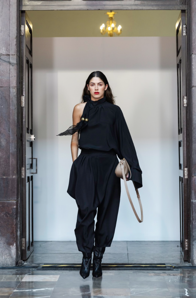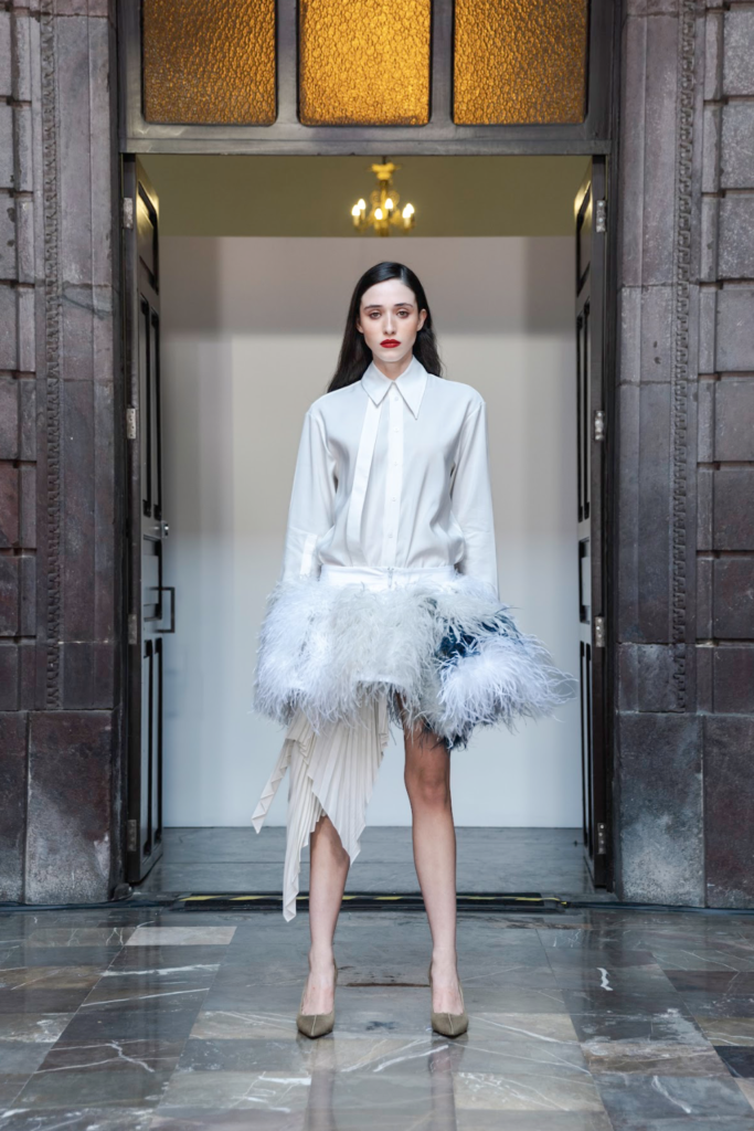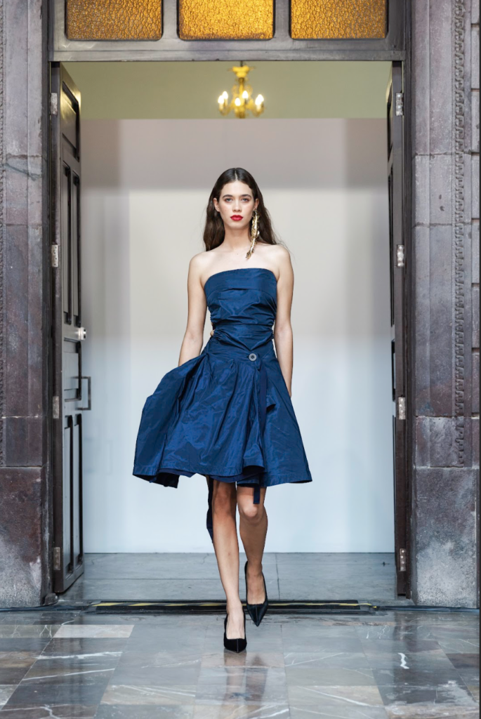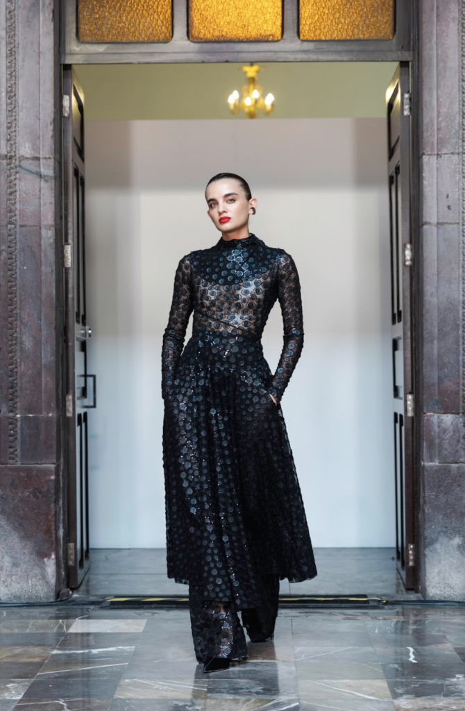 Lejos de seguir tendencias pasajeras, el diseñador construye una narrativa donde la silueta femenina se convierte en el eje principal. Cada look responde a una intención clara: definir el cuerpo desde la técnica.