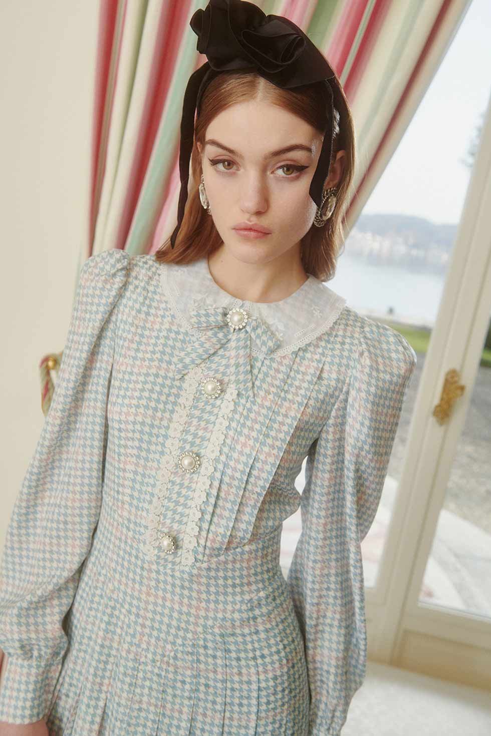 Sus modelos, lucen dulces con vestidos de flores midi con botones de pedrería y chaquetas de tartán cuadradas sobre minivestidos atrevidos.