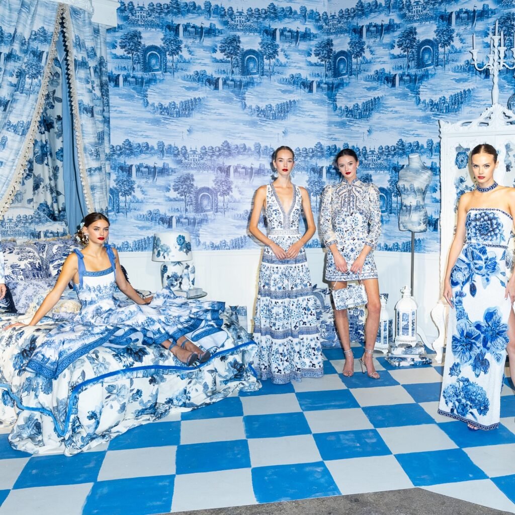 A lo largo del show, los invitados pasaban por un espacio dividido en cuartos, cada uno con una temática diferente: flores de primavera, un mundo en blanco y negro, destellos en blanco o una representación de la cerámica china azul.