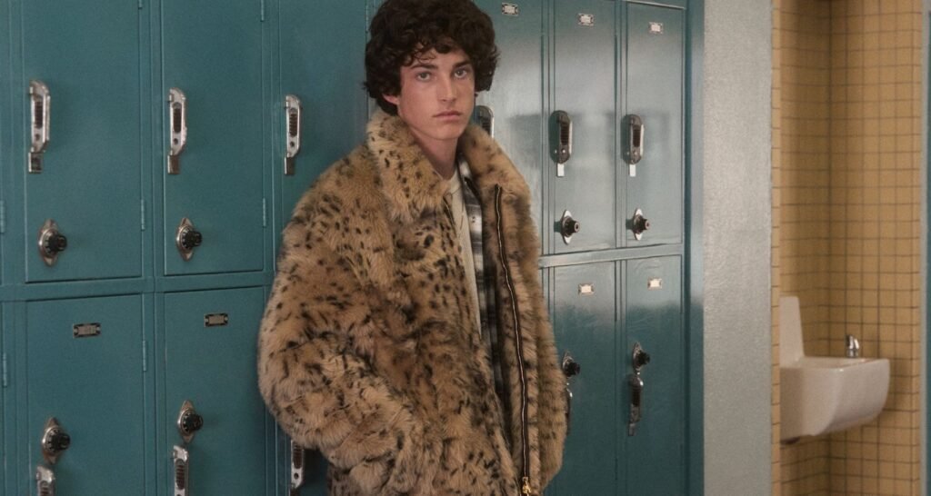 Guiños vintage conviven con la modernidad: bombers de cuero, chaquetas de piel sintética y denim gastado conviven con minifaldas, mocasines y sudaderas oversize, evocando un estilo californiano relajado y sofisticado a la vez.