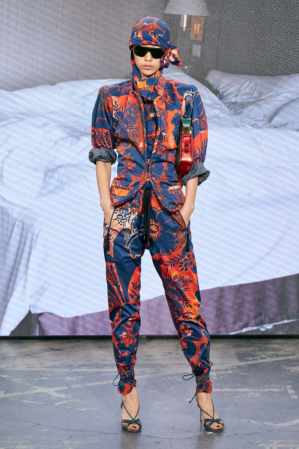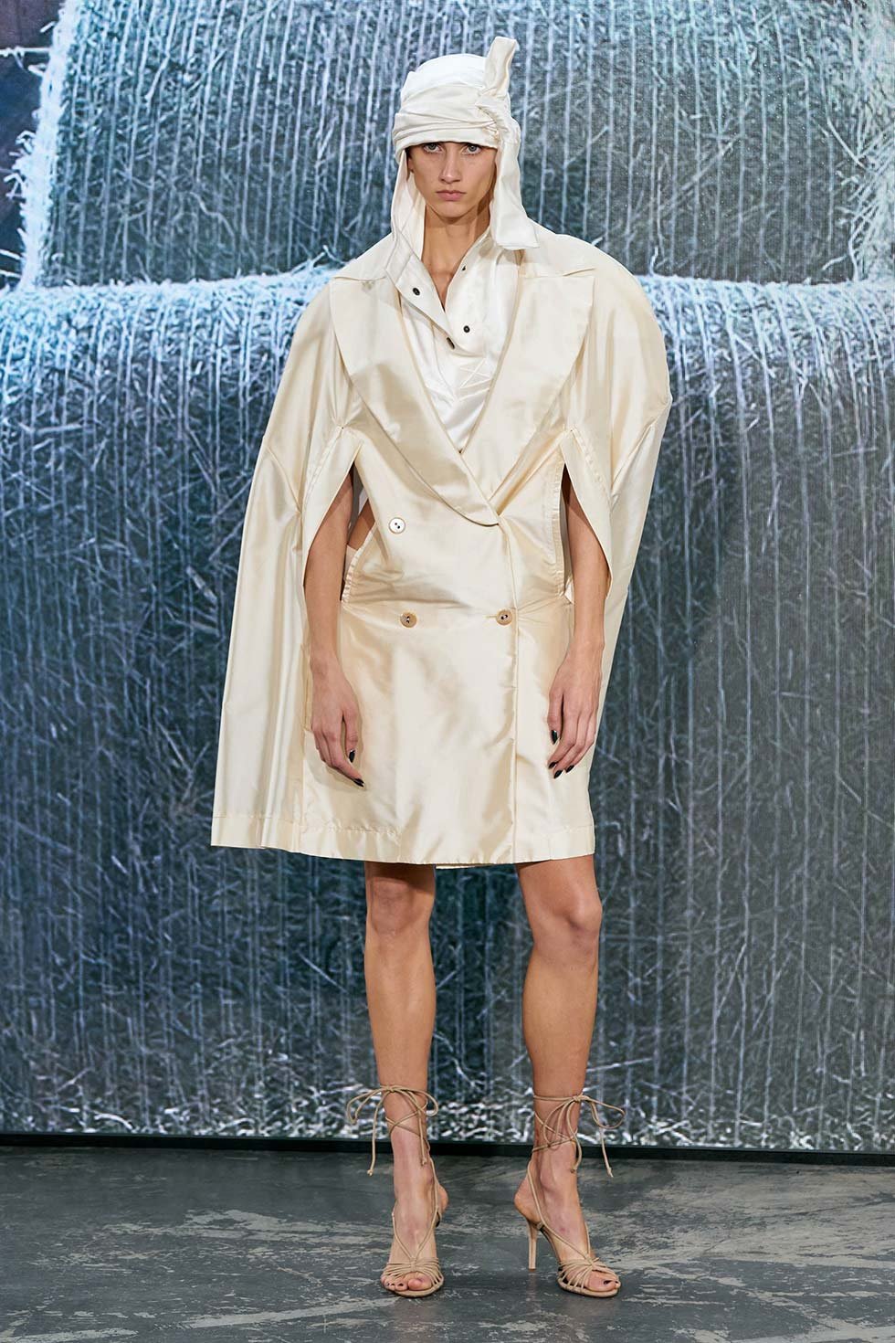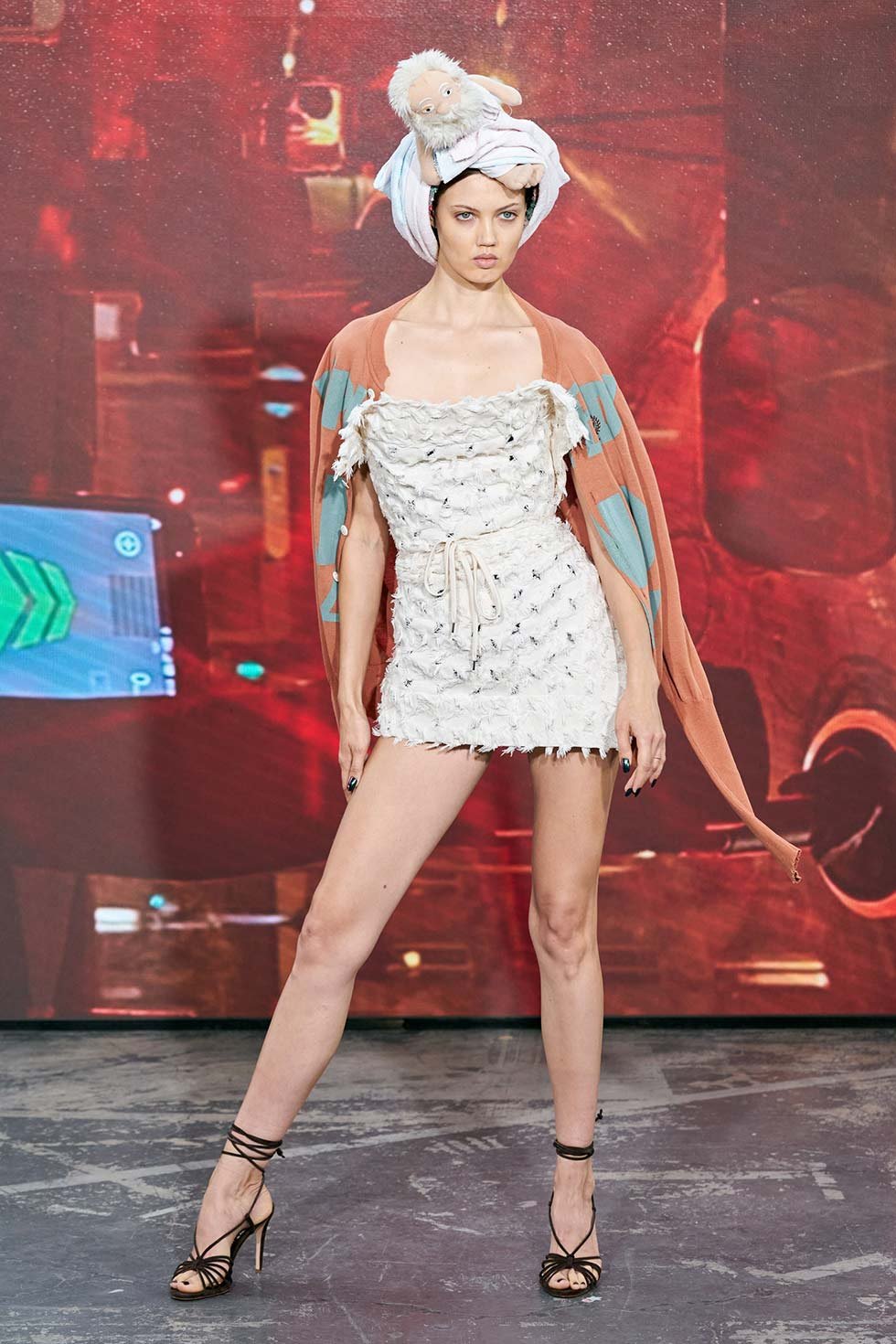Uno de los looks más sorprendentes fue el de Lindsey Wixson, que iba acompañada con un peluche de Sócrates envuelto en la cabeza con un trozo de tela.