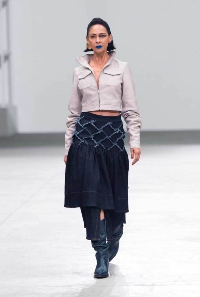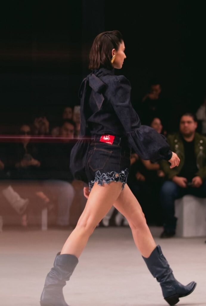 La textura protagonista de CHINGONA x BERNARDA es, sin duda, el cuero trabajado, que domina la pasarela con su presencia imponente y su capacidad de transformar cada prenda en una armadura de fuerza y estilo. Complementando esta pieza central, la mezclilla aporta un toque urbano y contemporáneo, mientras que el algodón suaviza la narrativa con movimientos ligeros y naturales. Esta combinación crea un lenguaje visual que habla de resistencia, poder y feminidad, convirtiendo cada outfit en una experiencia táctil y emocional.