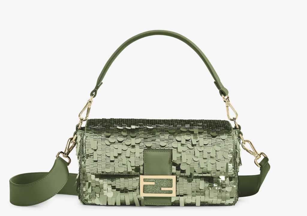 Esta pieza es la definición de lujo y elegancia. El modelo Baguette de Fendi, uno de los más icónicos de la casa, ha sido reinventado con lentejuelas verdes bordadas que le dan un toque moderno y fresco. Perfecta para combinar con un look de día o darle un toque brillante a un outfit más formal por la noche. Su tamaño y su facildad la hacen la bolsa perfecta.