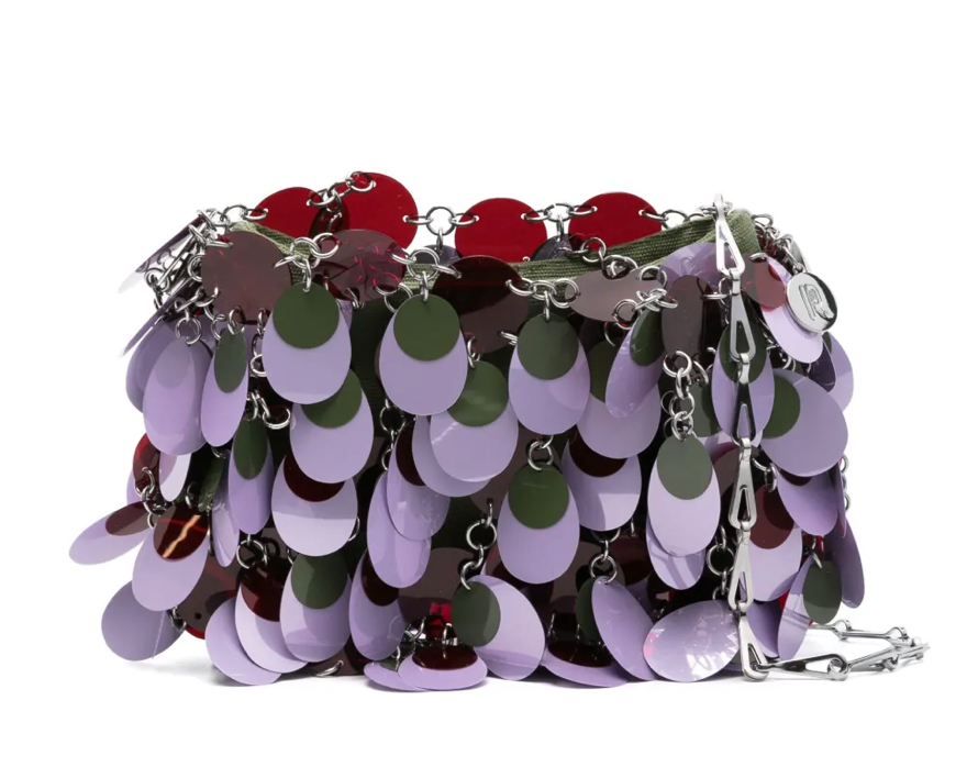 El modelo clásico de Rabanne con su icónica estructura metálica se reinventa este 2025 con una versión completamente cubierta de lentejuelas. Esta bolsa es un verdadero statement piece, ideal para quienes buscan algo único y moderno.