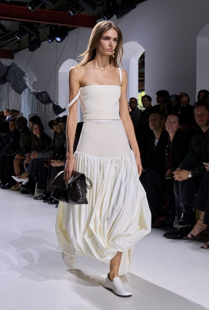 Cada vestido, abrigo o bolso parecía bailar con la luz, transformando el taller de Bottega Veneta en un escenario vivo donde tradición e innovación se encuentran.