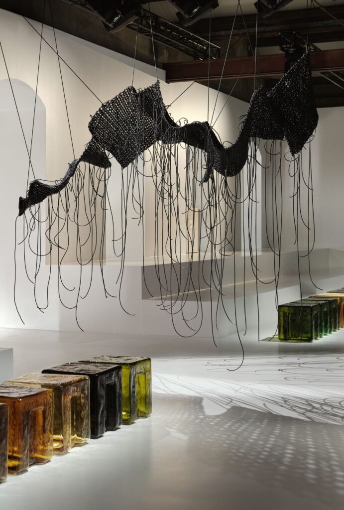El desfile de Bottega Veneta SS26 se desplegó en un escenario minimalista, donde los arcos dividían la pasarela y los invitados se acomodaban en taburetes de vidrio de colores, permitiendo que cada pieza brillara por sí misma. Las esculturas de cuero tejido, suspendidas estratégicamente, funcionaban casi como arte en movimiento, integrando la artesanía al espacio de manera orgánica.